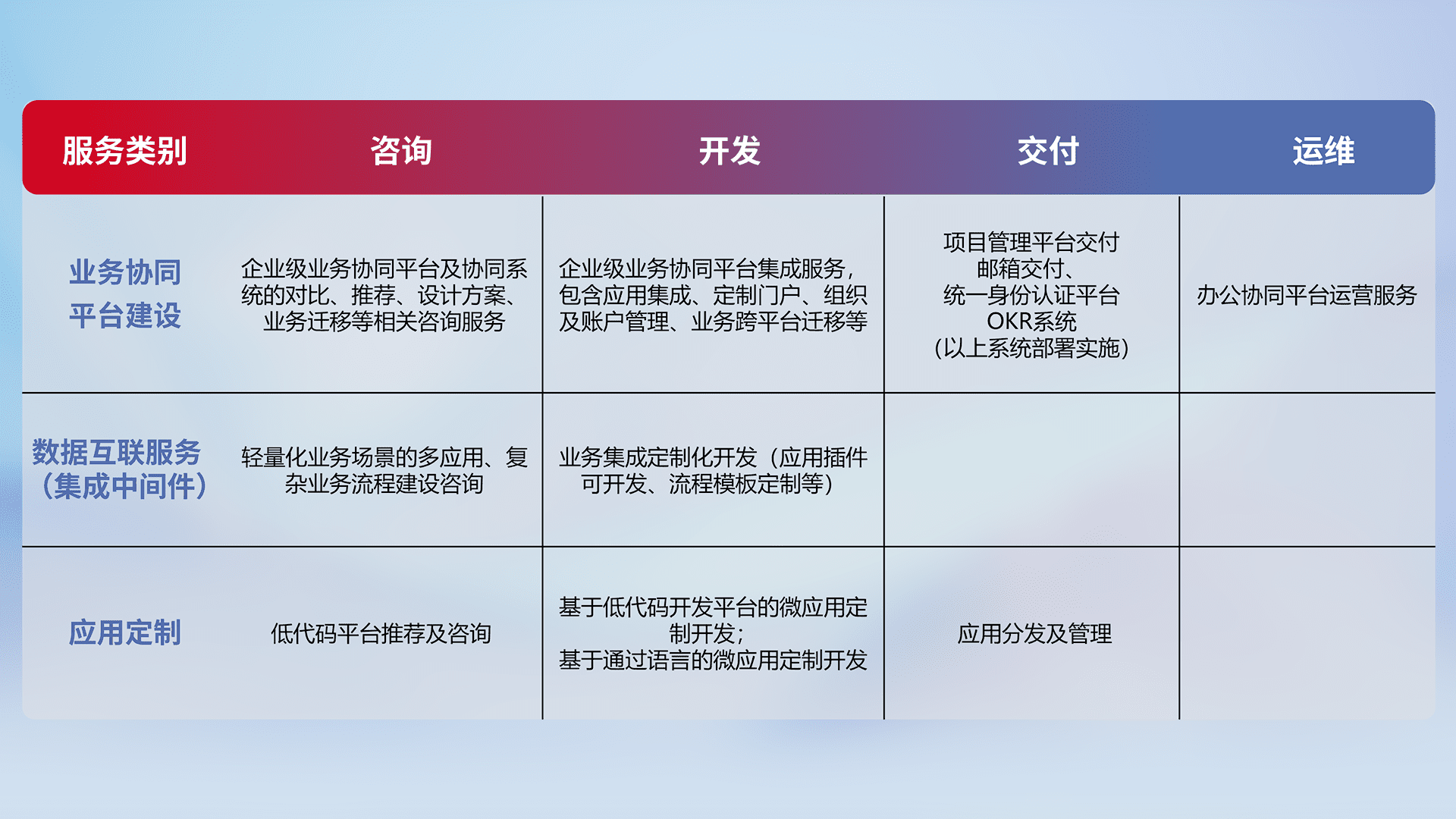 针对钉钉、、企微、、IDaas等平台级产品提供产品的规划、、、方案、、、、交付、、、定制化开发等服务,,,,实现如统一协同办公、、、智能客户服务、、、、混合会议管理、、、、智能数据查询、、、等业务场景,,实现数字化转型。。